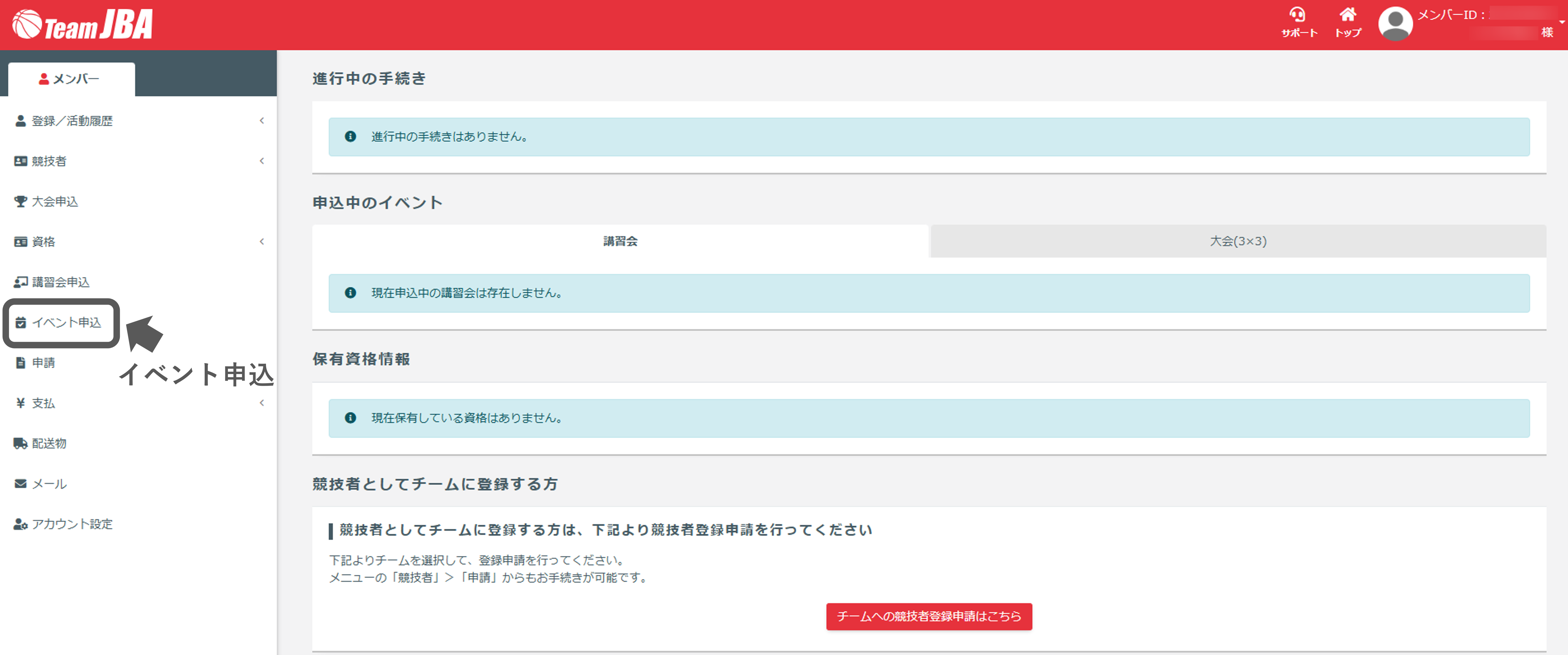 1.「メンバー」メニューの「イベント申込」を選択します。