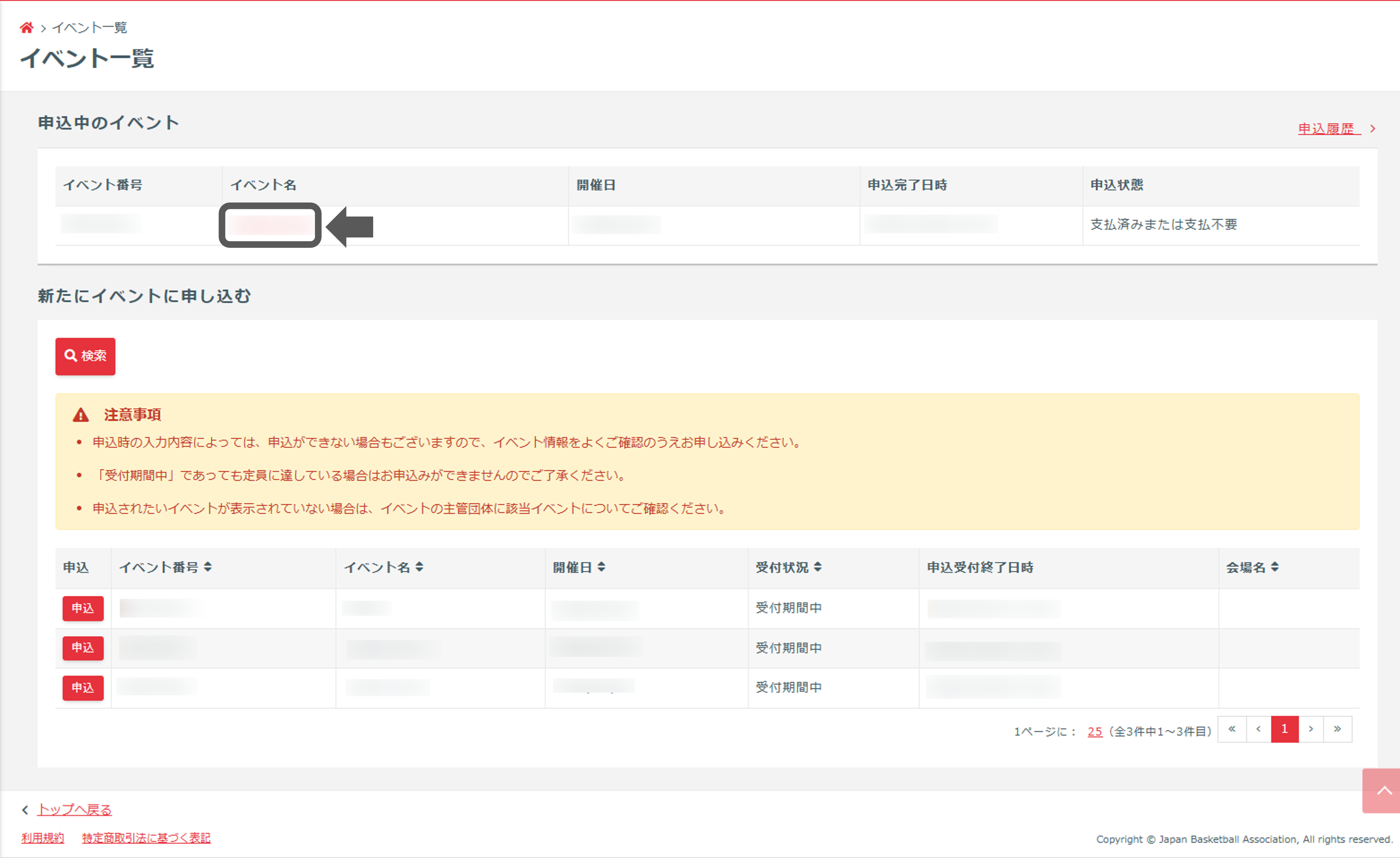 2.イベント一覧から「イベント名のリンク」を選択します。