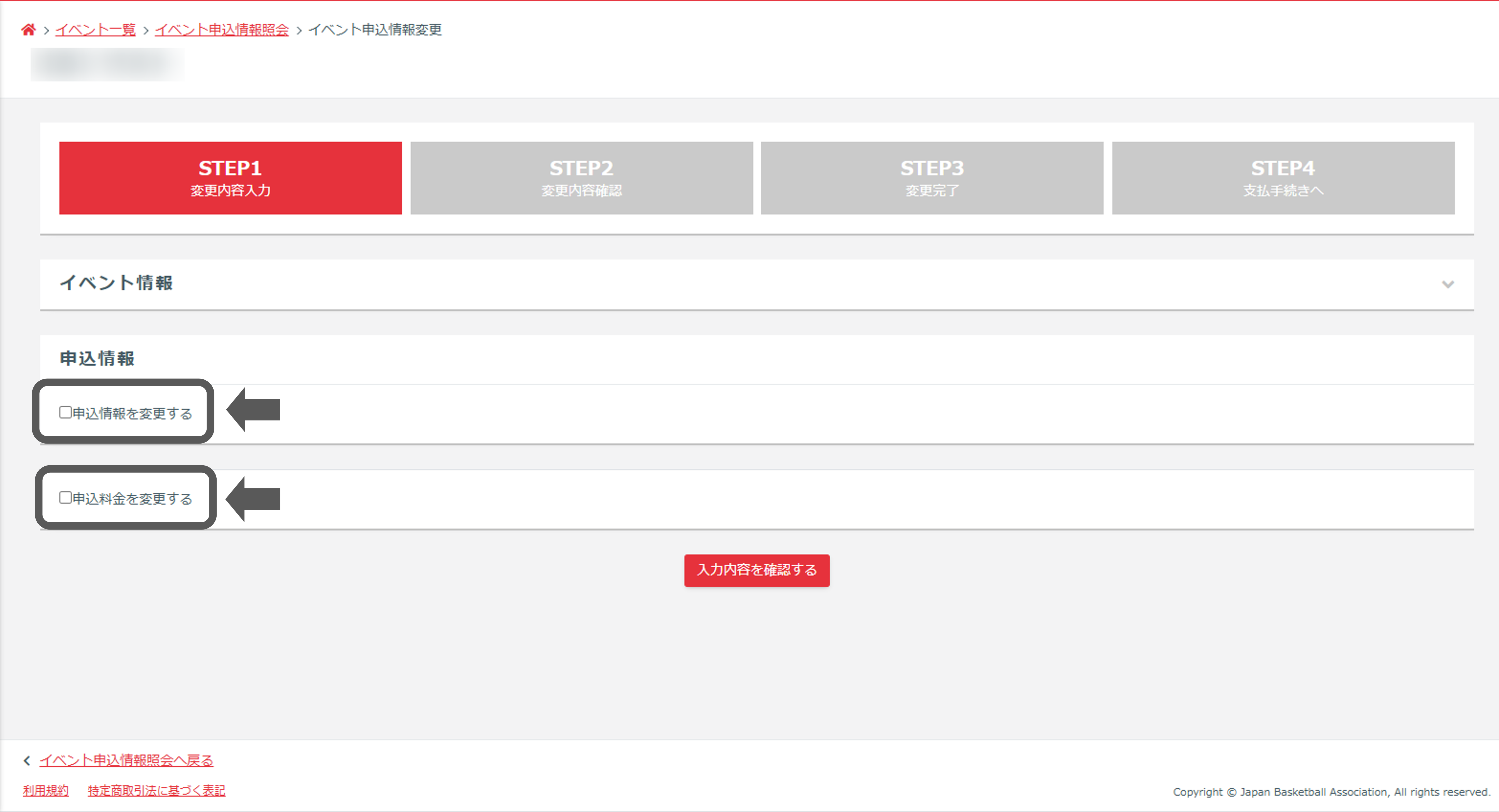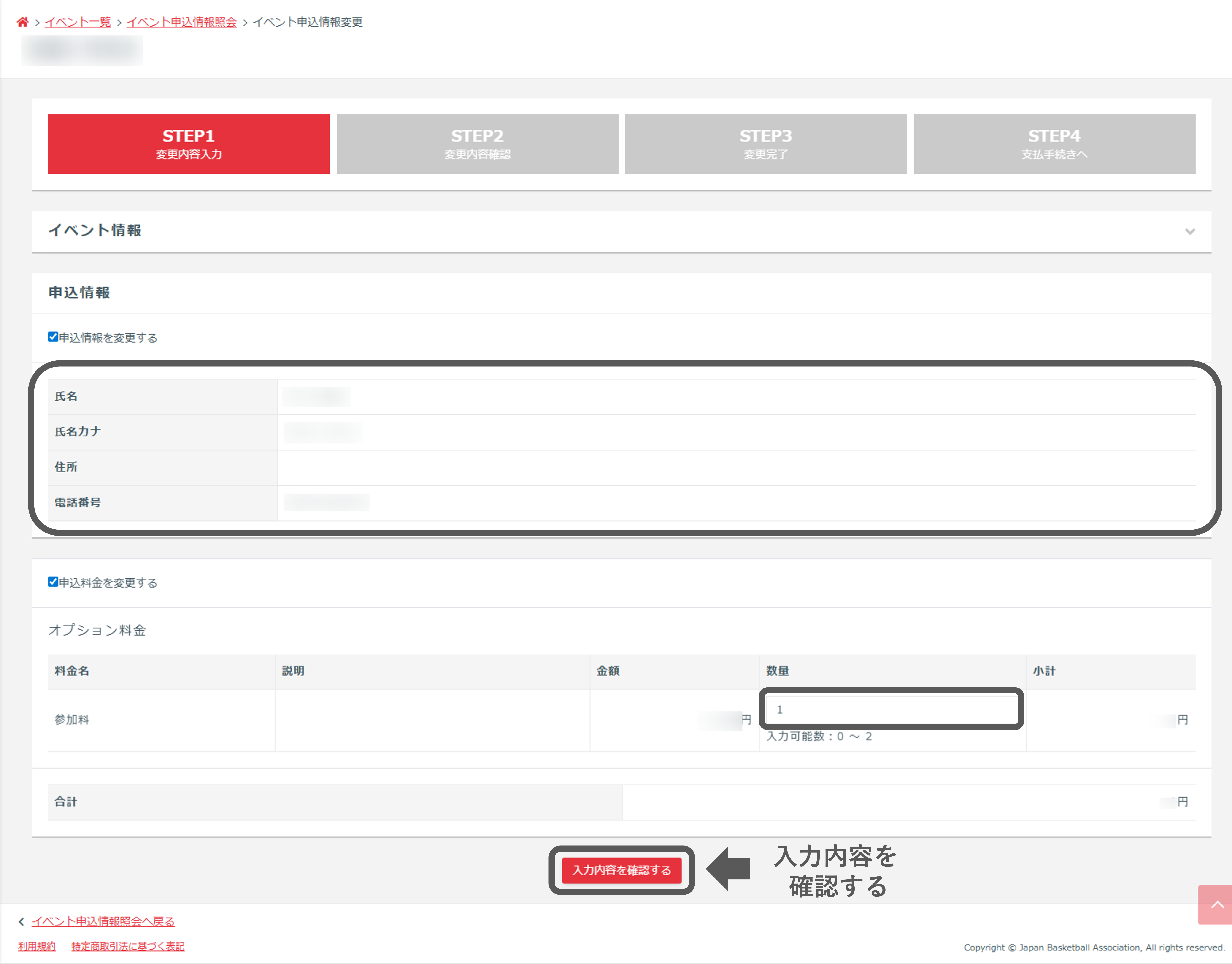 この手順ではイベント申込時に入力した内容やオプション料金の数量を変更することができます。