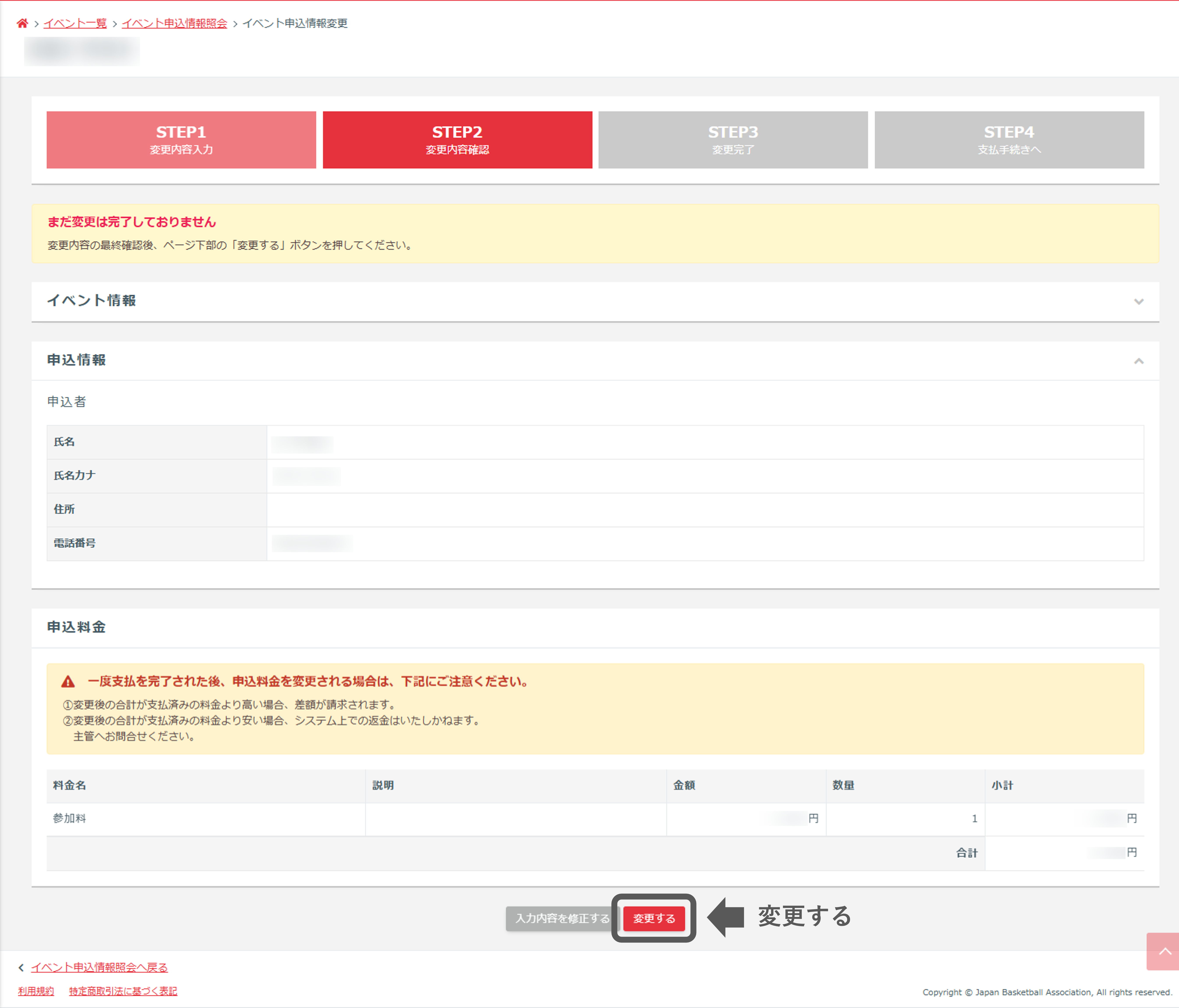 なお、イベント申込情報変更で申込料金を変更すると、追加の支払いや返金が生じる場合があります。
