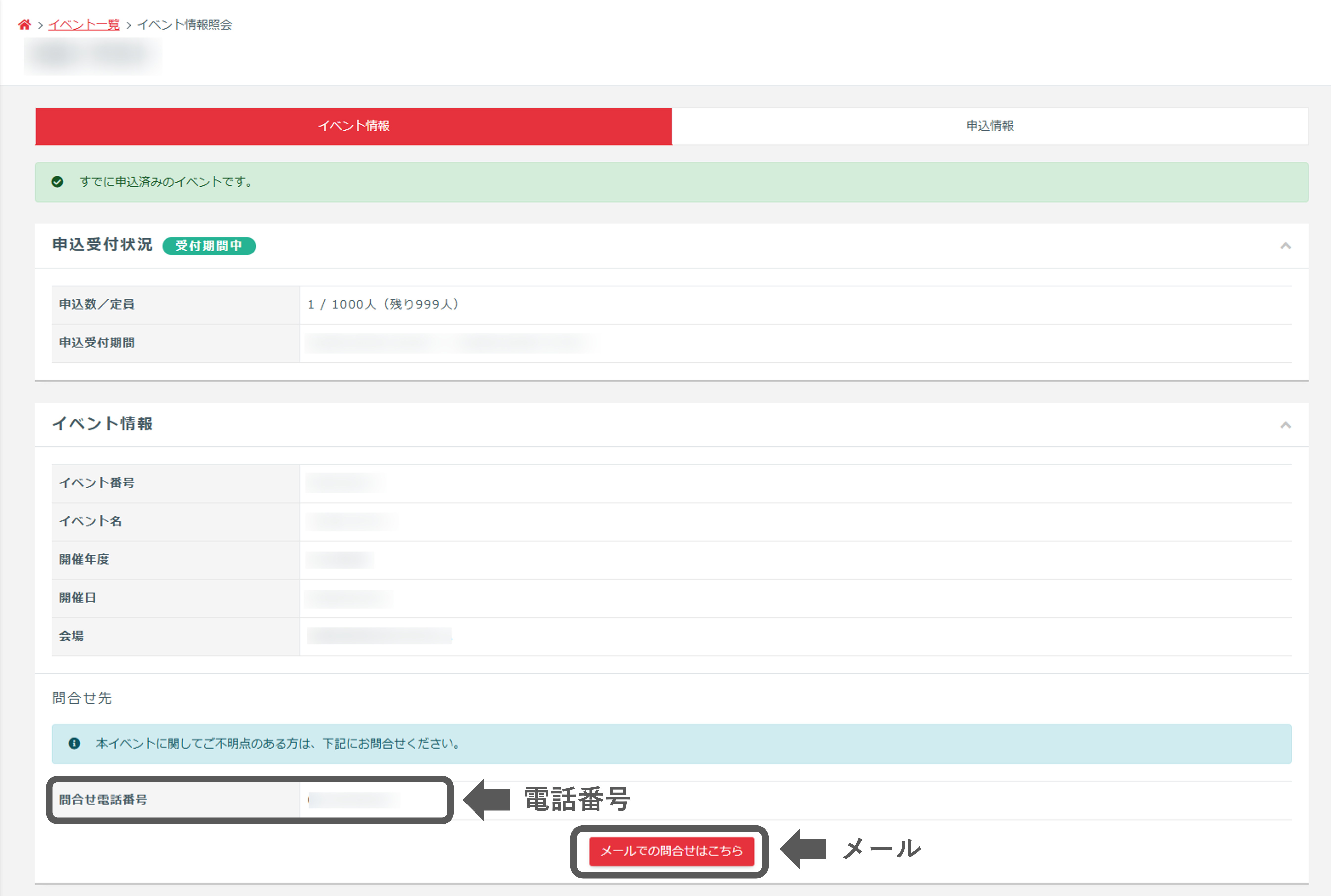 イベントへ申し込み後に、イベントに関する問い合わせをする場合の連絡先確認や問い合わせ手順です。